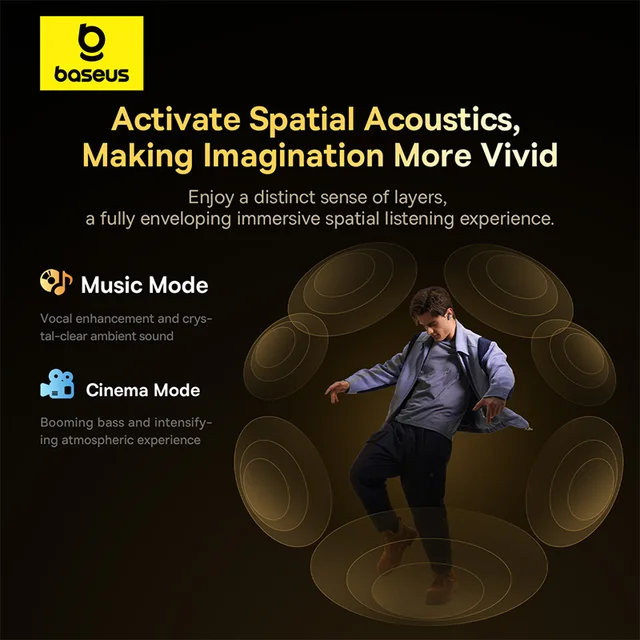 - Immersive 3D Spatial Acoustics (BISA): Baseus Immersive Spatial Acoustics technology (HRTF-based) recreates directional cues for a layered, theater-like listening experience in music, movies, and games.